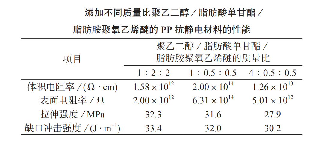 选用聚乙二醇作为抗静电剂中的润滑功能组分。在上述优选出的脂肪酸单甘酯/脂肪胺聚氧乙烯醚配方基础上,研究聚乙二醇/脂肪酸单甘酯/脂肪胺聚氧乙烯醚的质量比对PP抗静电材料体积电阻率、表面电阻率、拉伸强度和缺口冲击强度的影响。以PP为应用载体,将不同质量比的聚乙二醇/脂肪酸单甘酯/脂肪胺聚氧乙烯醚(总质量分数为2.0%)与其共混,结果如下表所示,聚乙二醇/脂肪酸单甘酯/脂肪胺聚氧乙烯醚的质量比为1∶2∶2时,材料的力学性能和抗静电性能最好。