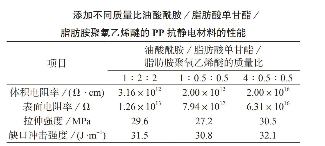 选用油酸酰胺作为复合抗静电剂中脱模功能组分。在优选出的脂肪酸单甘酯/脂肪胺聚氧乙烯醚配方基础上,研究油酸酰胺/脂肪酸单甘酯/脂肪胺聚氧乙烯醚的质量比对PP抗静电材料体积电阻率、表面电阻率、拉伸强度和缺口冲击强度的影响。以PP为应用载体,将不同质量比的油酸酰胺/脂肪酸单甘酯/脂肪胺聚氧乙烯醚(总质量分数为2.0%)与其共混,结果如下表:当油酸酰胺/脂肪酸单甘酯/脂肪胺聚氧乙烯醚的质量比为4∶0.5∶0.5时,材料的力学性能最佳,但抗静电性能最差;而质量比为1∶0.5∶0.5时,抗静电性能最好,但是拉伸强度最差;当质量比为1∶2∶2时,在满足材料力学性能的同时,其抗静电性能也好。