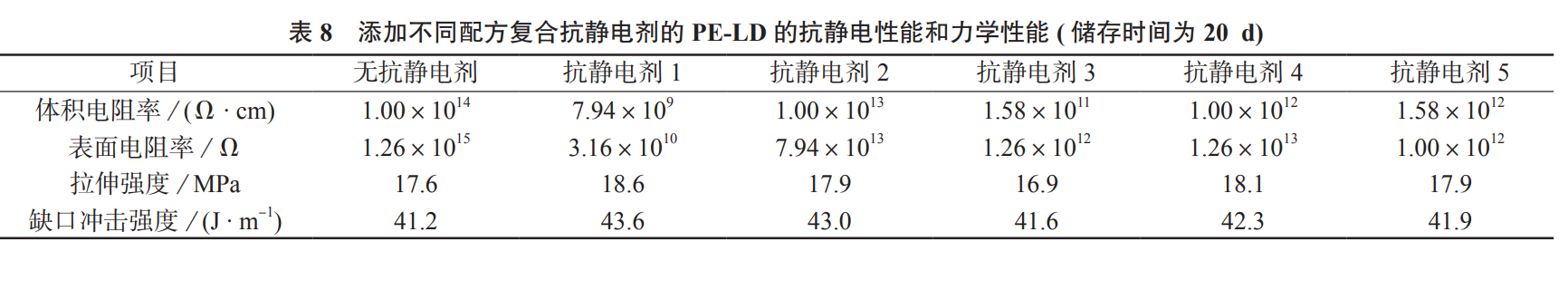 复合抗静电剂各组分分别为:脂肪酸单甘脂(A)、脂肪胺聚氧乙烯醚(B)、聚乙二醇(C)、油酸酰胺(D)、芥酸酰胺(E)、羟乙基乙撑双硬脂酰胺(F)。将不同配方的复合抗静电剂(总质量分数为2.0%)添加到PE-LD中,研究不同配方复合抗静电剂对PE-LD抗静电性能和力学性能的影响,得到复合抗静电剂各组分的最佳质量比。添加不同配方复合抗静电剂的PE-LD的抗静电性能和力学性能列于下表。
