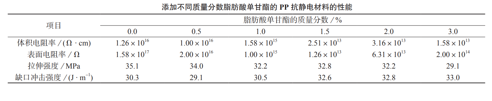 复合抗静电剂中基础材料的最佳用量分析。选用脂肪酸单甘酯作为抗静电剂的基础材料,以PP为应用载体,研究不同质量分数脂肪酸单甘酯对PP抗静电材料体积电阻率、表面电阻率、拉伸强度和缺口冲击强度的影响,由下表可以看出,脂肪酸单甘酯的质量分数为1.5%时,材料的体积电阻率和表面电阻率降低较多,特别是表面电阻率下降了4个数量级,抗静电效果较好,且对拉伸强度的影响较小。因此,考察抗静电剂基础材料的性价比,脂肪酸单甘酯的质量分数为1.5%为最佳比例。