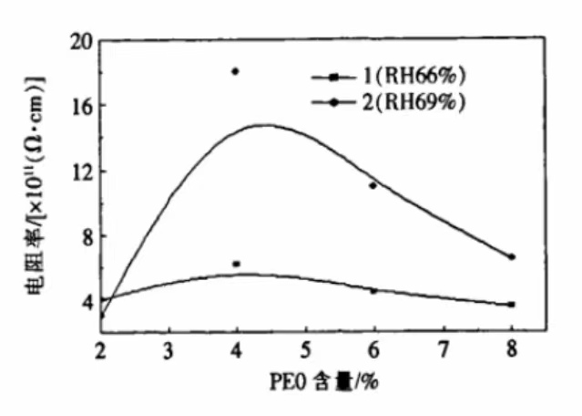 从图1、图2可看出,随湿度增加,加 抗静电剂的 PET 电阻率均明显降低,因为 PEO 、PSO2含有极性亲水基团和疏水基团,一部分抗静电剂迁移到 PET 表面,抗静电剂结构中亲水基团吸收空气中的水分从而增加 PET 的表面吸湿性,使积累在 PET 表面的电荷泄露,导致 PET 表面电阻下降,抗静电性变好。