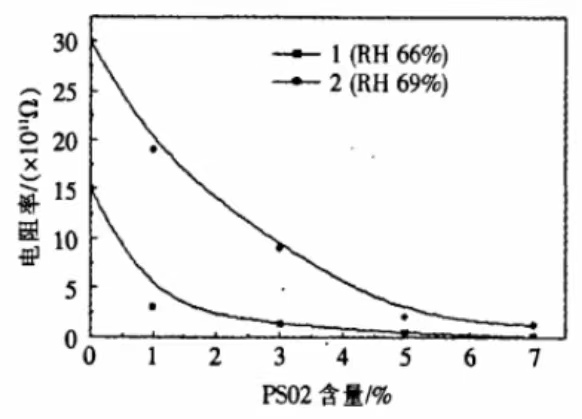 图一 湿度对 PS02/PET体系表面电阻率的影响