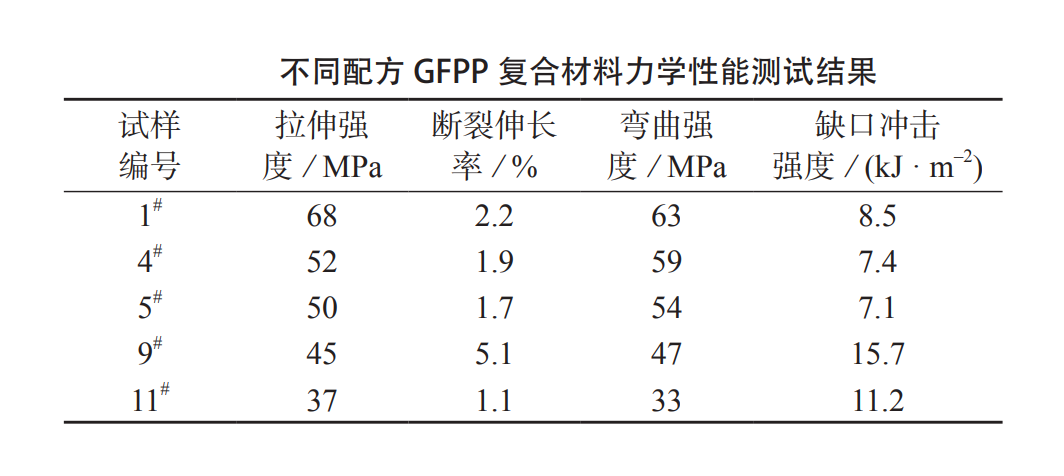 不同配方复合材料的力学性能见下表,可以看出,添加阻燃剂抗静电剂LI101P使复合材料的力学性能有一定程度下降。未添加阻燃剂的GFPP(1#)拉伸强度为68MPa,阻燃剂抗静电剂LI101P添加20%(4#)及25%(5#)的阻燃GFPP样品,其拉伸强度分别为52MPa和50MPa,说明拉伸强度随着阻燃剂含量的增加而降低。阻燃剂抗静电剂LI101P的加入还使复合材料的断裂伸长率、弯曲强度及缺口冲击强度均呈不同程度下降。从1#,9#试样测试结果可以看出,添加永久抗静电剂P–22使复合材料的拉伸强度和弯曲强度有一定程度降低。P–22添加量为20%时,分别从68MPa和63MPa降低至45MPa和47MPa,而断裂伸长率和缺口冲击强度分别从2.2%和8.5kJ/m2升高至5.1%和15.7kJ/m2,这是因为P–22特殊的聚醚酰亚胺结构对GFPP材料具有一定的增韧功能。当抗静电剂LI101P添加量为25%,P–22添加量20%时,复合材料的拉伸强度为37MPa,缺口冲击强度为11.2kJ/m2,该无卤阻燃永久抗静电GFPP复合材料的力学性能仍维持在较高的水平,具有良好的应用价值。