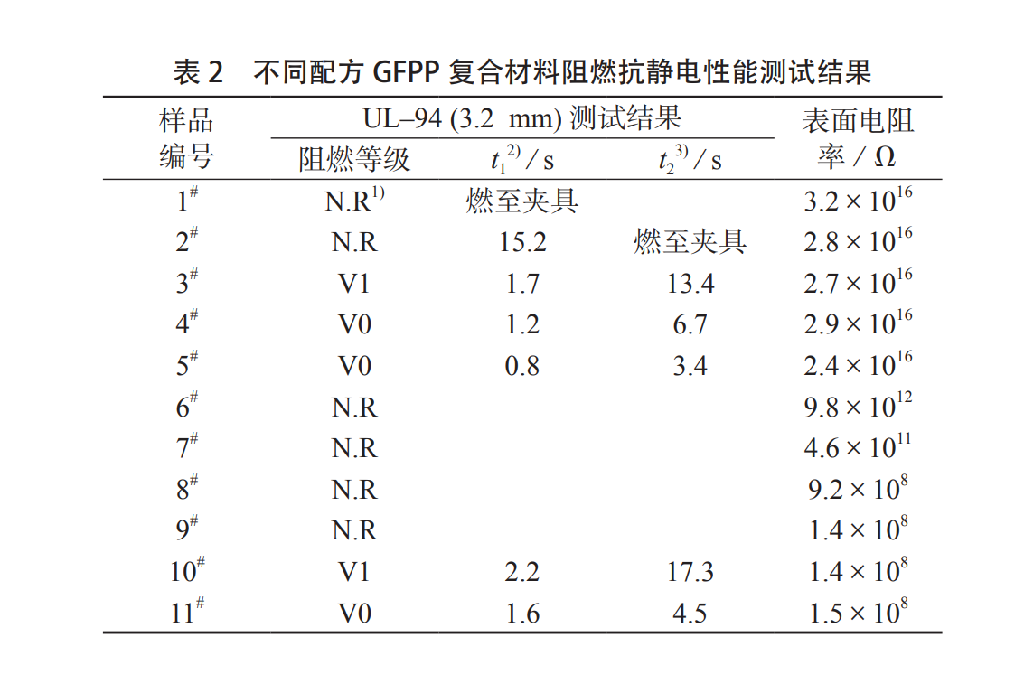 由上表数据可知,不同配方 GFPP 复合材料 阻燃抗静电性能测试结果不同,随着 永久抗静电剂 P–22添加量增加, GFPP复合材料的表面电阻率不断减小。纯 GFPP的表面电阻率为 3.2×1016Ω,当 P–22的添加量为 15%时,复合材料表面电阻率显著下降 8个数量级,达到 9.2×108Ω;当添加量为 20%时,复合材料的表面电阻率下降至 1.4×108Ω,达到 MT113–1995标准 (不大于 3×108Ω)。