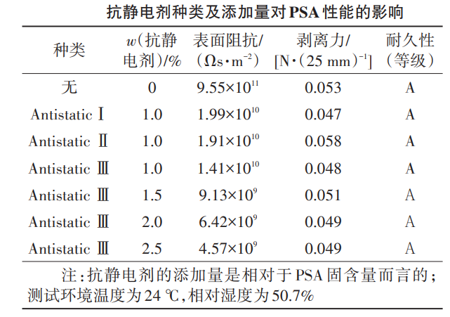 在使用过程中,部分偏光片产品有抗静电需求,通常是在 PSA 中添加 抗静电剂来改善其抗静电性能。不同的 抗静电剂因与 PSA 的相容性不同而表现出不同的抗静电性能。抗静电剂种类及添加量对PSA 性能的影响如下表所示。