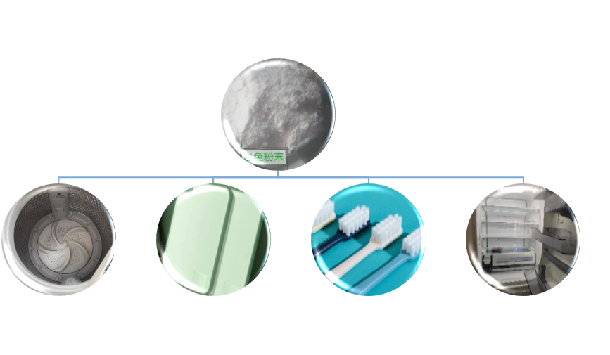 广泛应用于家电制品、通讯器材、卫生洁具、日用品、儿童玩具等。适用于硅橡胶、涂料、以及各种塑料制品,尤其适用于以PP/PE/ABS/HIPS/PVC/PBT等为基料的注塑和挤出制品,如可以制成抗菌冰箱、抗菌洗衣机、抗菌电话、抗菌菜板、抗菌玩具、抗菌键盘、抗菌纱线、抗菌牙刷、抗菌马桶盖板、抗菌医疗器械等等。